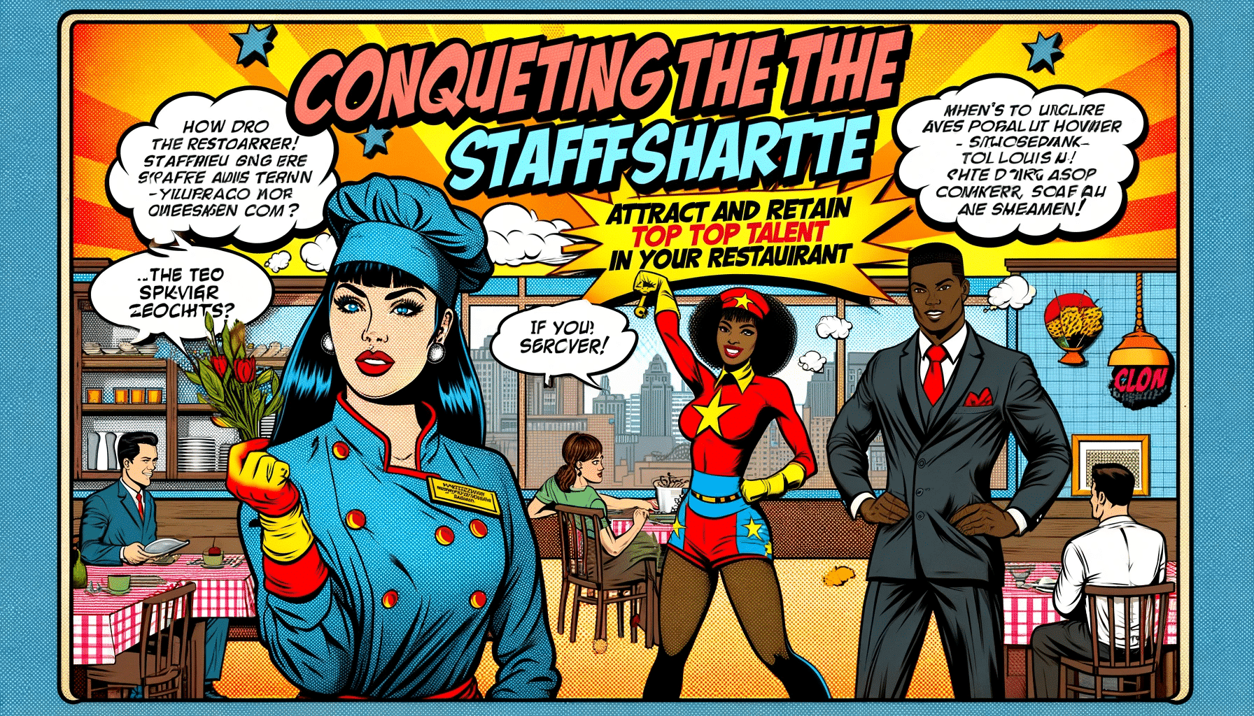 Previous Image Next Image DALL·E 2023-12-07 23.06.48 – A retro comic book style illustration for the theme ‘Conquering the Staffing Shortage_ Attract and Retain Top Talent in Your Restaurant’. The image sh